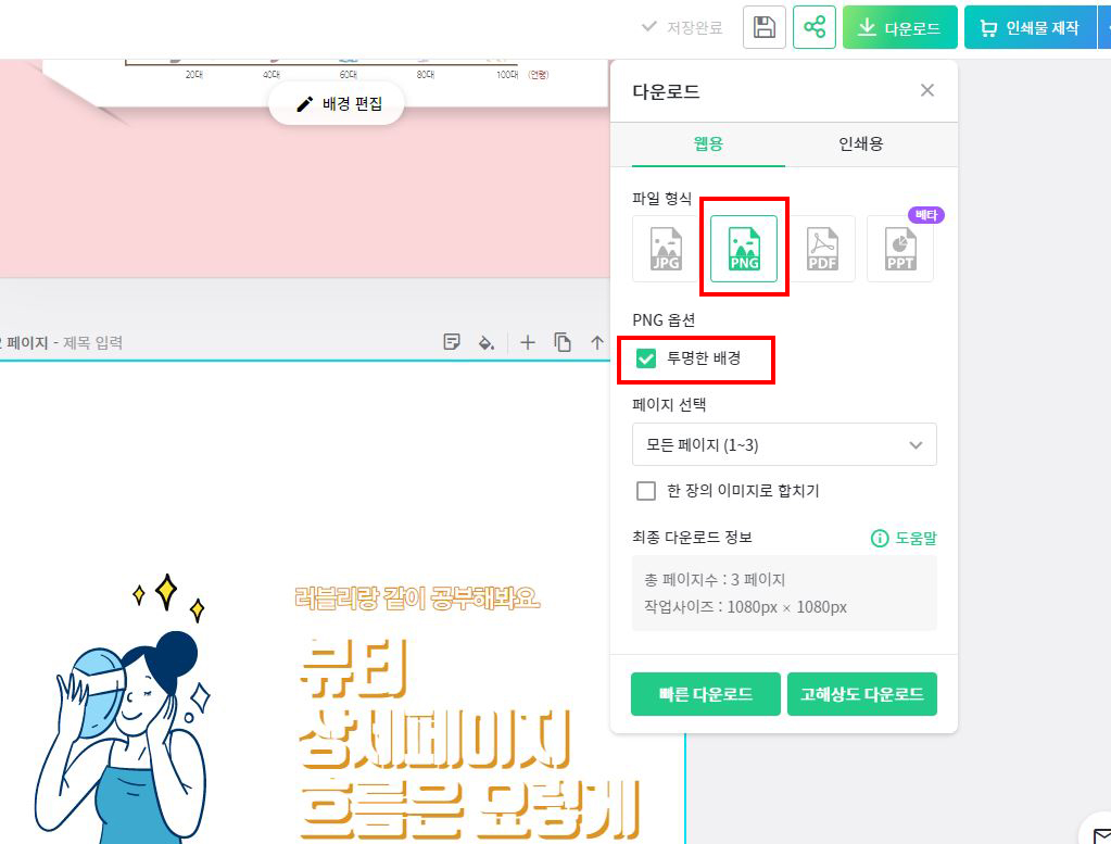 ํ์ผํ์ "PNG"๋ฅผ ์ ํํ์๊ณ "PNG ์ต์ "์์ ํฌ๋ช ํ ๋ฐฐ๊ฒฝ์ ์ฒดํฌํด์ค๋๋ค.