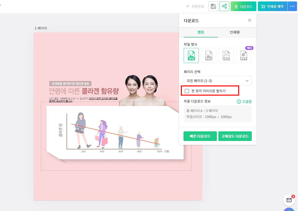 "ํ ์ฅ์ ์ด๋ฏธ์ง๋ก ํฉ์น๊ธฐ"์ ๊ฒฝ์ฐ ์ฌ๊ธฐ์์ ์์ ๋ 3๊ฐ์ง ์ด๋ฏธ์ง๊ฐ ๋ชจ๋ ํ๋์ ์ด๋ฏธ์ง๋ก ํฉ์ณ์ ธ์ ๋ค์ด๋ก๋ ๋ฉ๋๋ค.