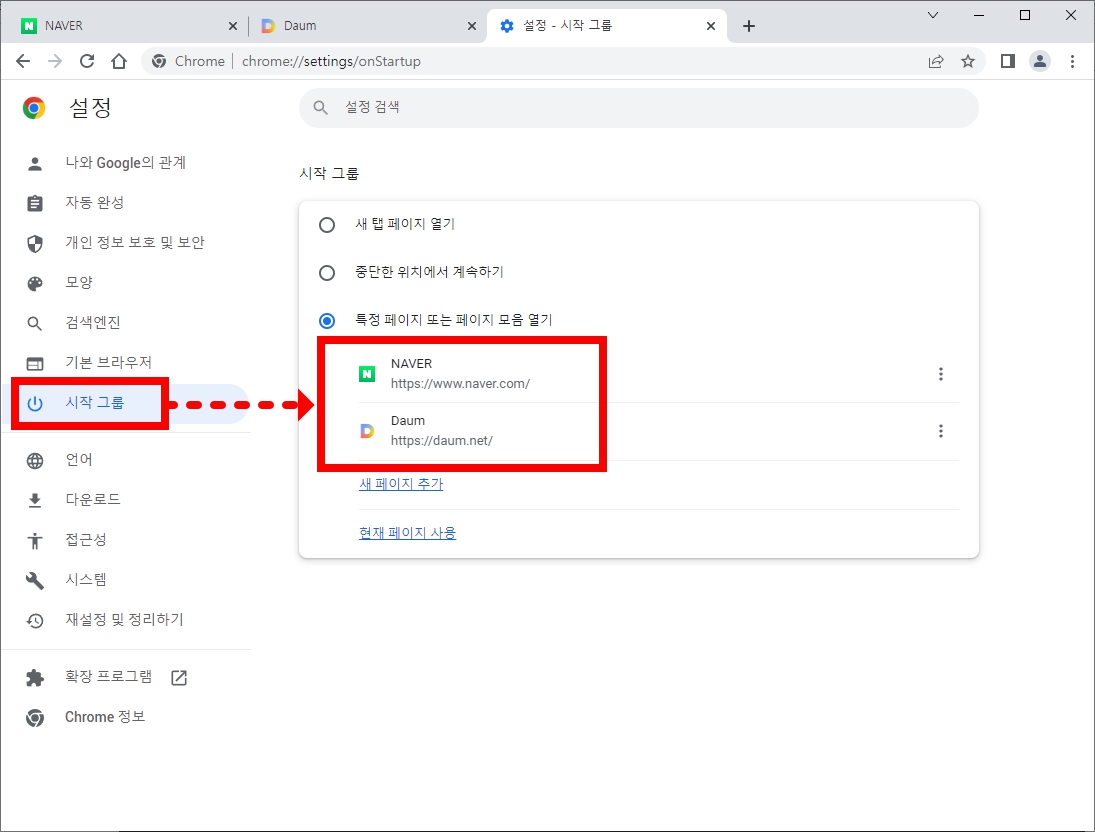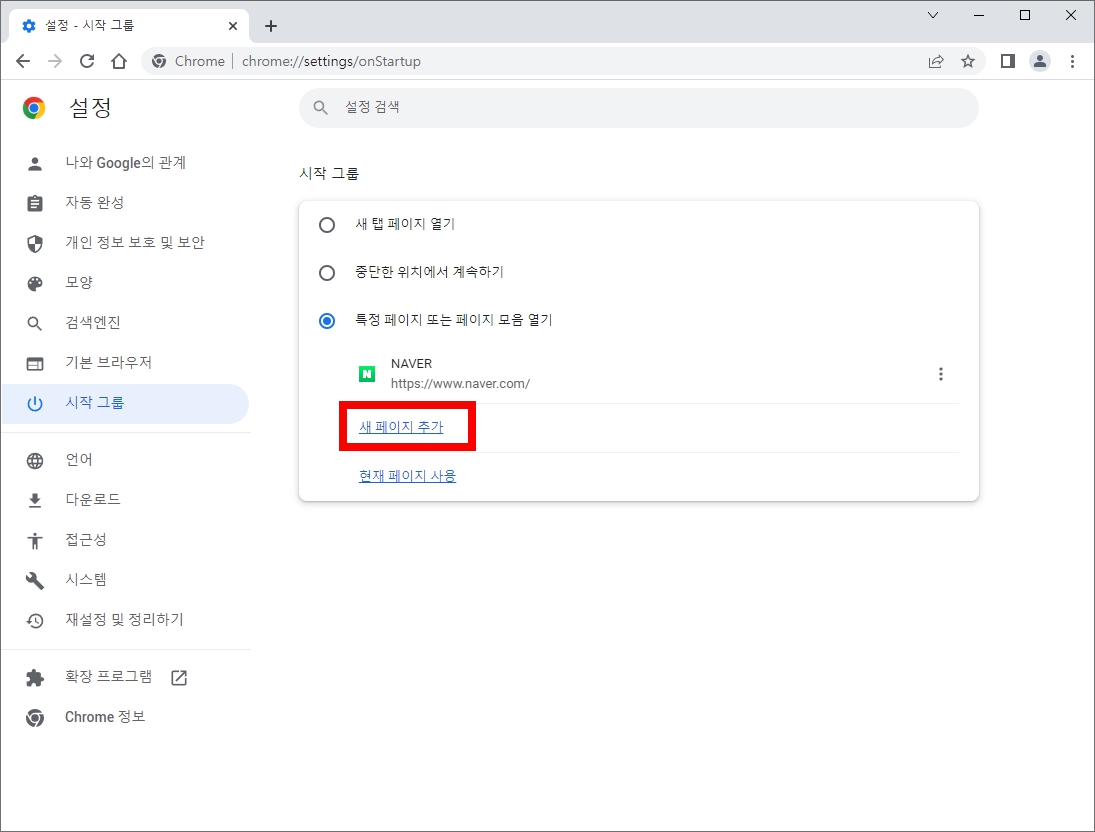 (3) [μ νμ΄μ§ μΆκ°] νμ μ°½μ΄ λμ€λ©΄ ν¬λ‘¬ 첫νλ©΄ μμνμ΄μ§μ λμ€κ² νκ³ μΆμ ννμ΄μ§ μ£Όμλ₯Ό μ λ ₯νκ³ [μΆκ°]λ²νΌμ ν΄λ¦ν©λλ€. μ λ λ€μ΄λ²λ₯Ό μμνμ΄μ§λ‘ μ€μ νμ΅λλ€.