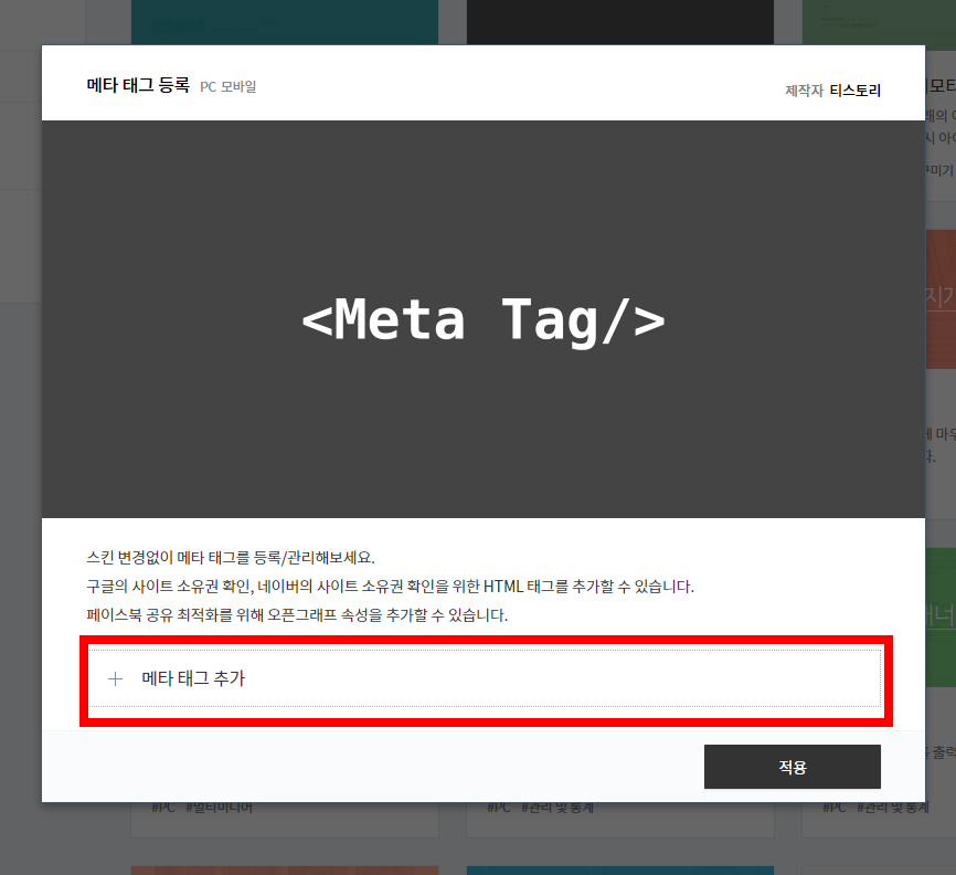 5) ํฐ์คํ ๋ฆฌ ๊ด๋ฆฌํ๋ฉด ์ผ์ชฝ์ "ํ๋ฌ๊ทธ์ธ"์ผ๋ก ๋ค์ด๊ฐ์ธ์. ์ฐ์ธก ํ๋ฉด์์ <Meta Tag/> "๋ฉํ ํ๊ทธ ๋ฑ๋ก"๋ฅผ ์ฐพ์ ํด๋ฆญํฉ๋๋ค.