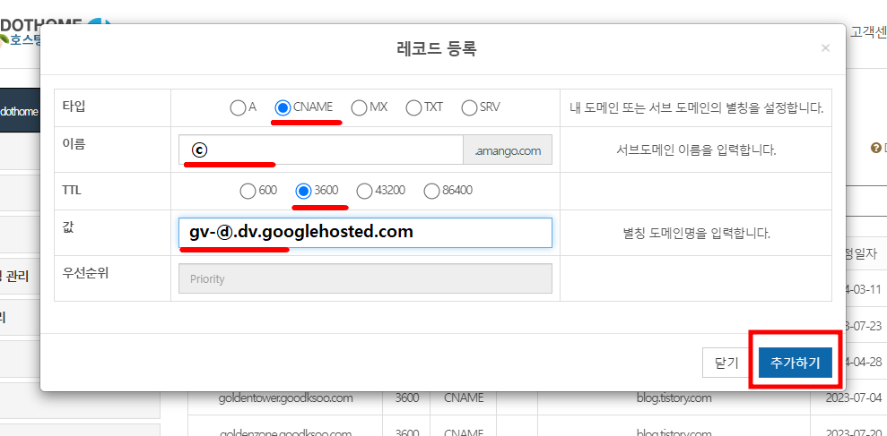 5. ๋ค์์ผ๋ก๋ ์ด ์๋ธ ๋๋ฉ์ธ์ ์์ ๊ถ์ ํ์ธํ๊ธฐ ์ํด ๋ค์ ํ๋ฒ [๋ ์ฝ๋ ์ถ๊ฐ]๋ฅผ ํด๋ฆญํ์ฌ ์๋์ ๊ฐ์ด ๋ ์ฝ๋๋ฅผ ๋ฑ๋กํ ํ [์ถ๊ฐํ๊ธฐ]๋ฅผ ํฉ๋๋ค.