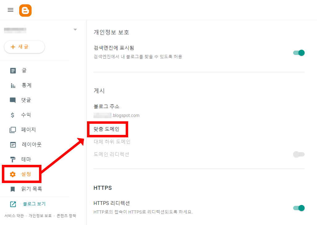 1. ๋๋ฉ์ธ์ ์ฐ๊ฒฐํ ๊ตฌ๊ธ ๋ธ๋ก๊ทธ ๊ด๋ฆฌ ํ๋ฉด์ผ๋ก ๋ค์ด๊ฐ [์ค์ ]์ ํด๋ฆญํ์ฌ ๋์ค๋ ํ๋ฉด์์ [๋ง์ถค ๋๋ฉ์ธ]์ ํด๋ฆญํฉ๋๋ค.