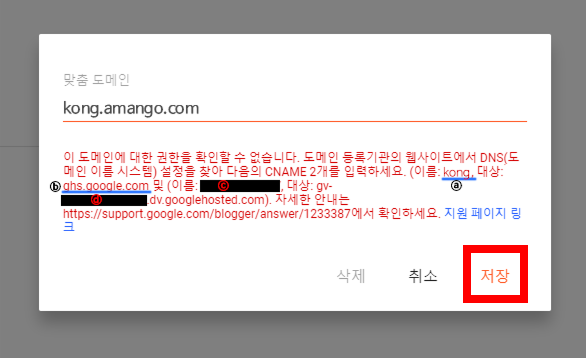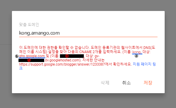 3. ์ ์ฅ ํ ์๋์ ๊ฐ์ ๋นจ๊ฐ์ ์๋ด๋ฌธ์ด ๋์ค๋ฉด ๋ณต์ฌํ์ฌ ๋ฉ๋ชจ์ฅ์ ์ ์ฅํด ๋์ต๋๋ค. ๋ฑ๋กํ ์๋ธ ๋๋ฉ์ธ์ ์์ ๊ถ์ ํ์ธํ๋ ์ ์ฐจ๋ก ๊ฐ ๊ตฌ๊ธ ๋ธ๋ก๊ทธ ์คํ๋ง๋ค ๋ค๋ฅธ ์ด๋ฆ๊ณผ ๋์ ์๋ด๊ฐ ๋์ค๋ ๋ณธ์ธ ๋ธ๋ก๊ทธ ๋ฉ์์ง๋ฅผ ์ ์ฅํด์ผ ํฉ๋๋ค. ์๋ ๋ฐ์ค์ ๊ฐ์ ์ ๋ณด๊ฐ ํ์ํฉ๋๋ค.
