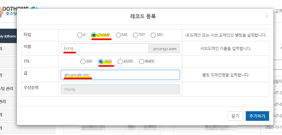 4. ํธ์คํ ์ฌ์ดํธ์ ์ ์ํฉ๋๋ค. ์ฐธ๊ณ ๋ก ์ ๋ ๋ทํ(dothome.co.kr)์ ์ด์ฉํ๊ณ ์์ต๋๋ค. [DNS ๊ด๋ฆฌ]๋ก ๋ค์ด๊ฐ์ [DNS ๋ ์ฝ๋ ๊ด๋ฆฌ]๋ก ๋ค์ด๊ฐ๋๋ค. [๋ ์ฝ๋ ์ถ๊ฐ] ๋ฒํผ์ผ๋ก ๋ ์ฝ๋๋ฅผ ์๋์ ๊ฐ์ด ๋ฑ๋กํ๊ณ [์ถ๊ฐํ๊ธฐ] ๋ฒํผ์ ๋๋ฆ ๋๋ค.