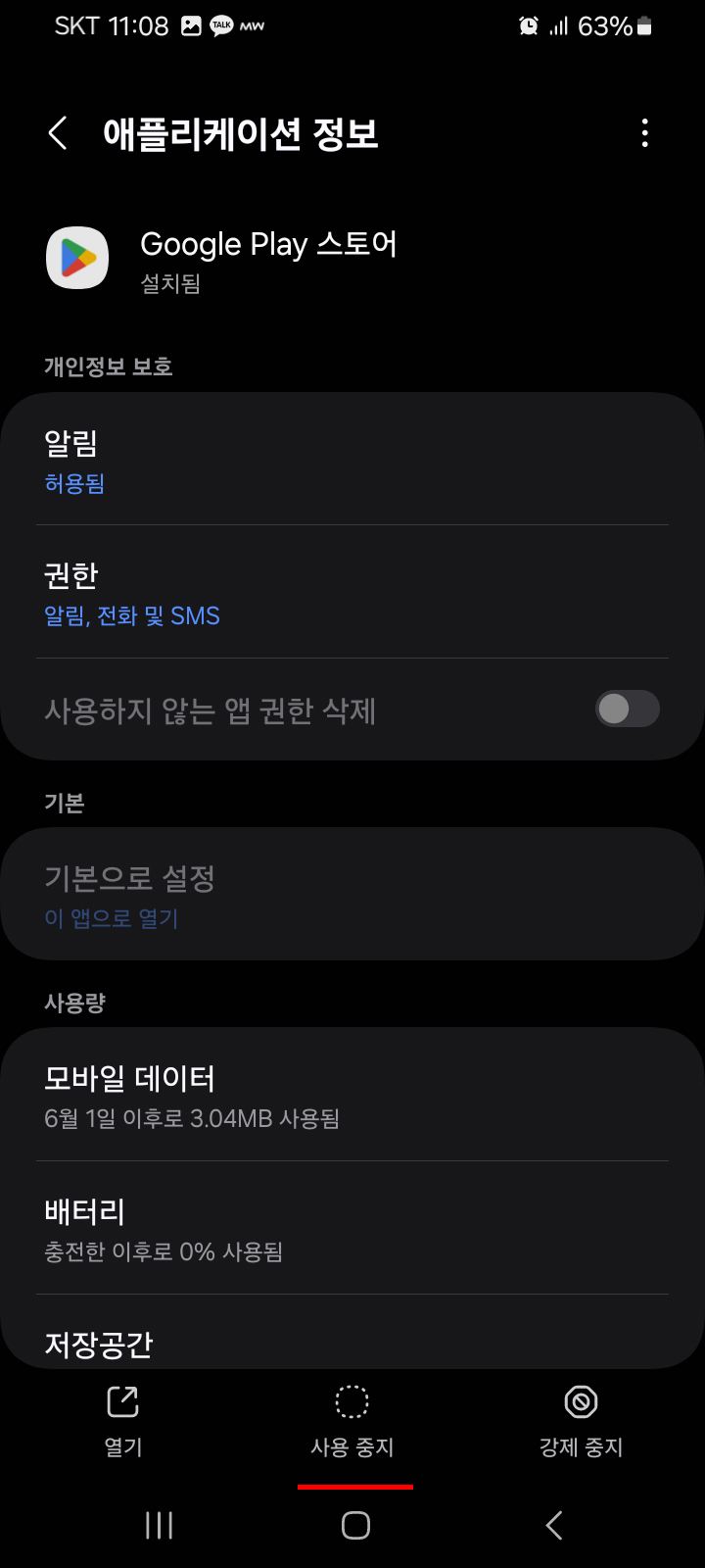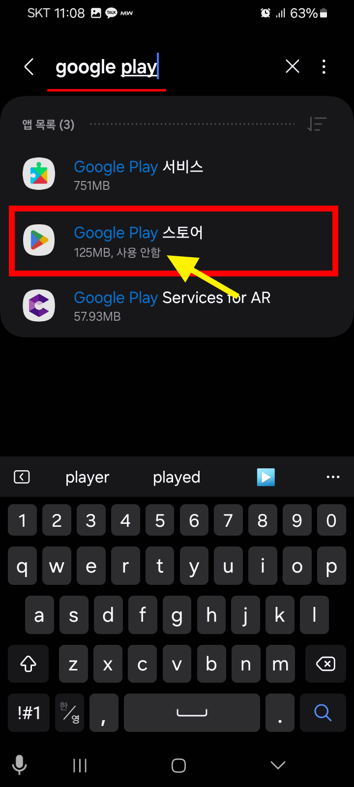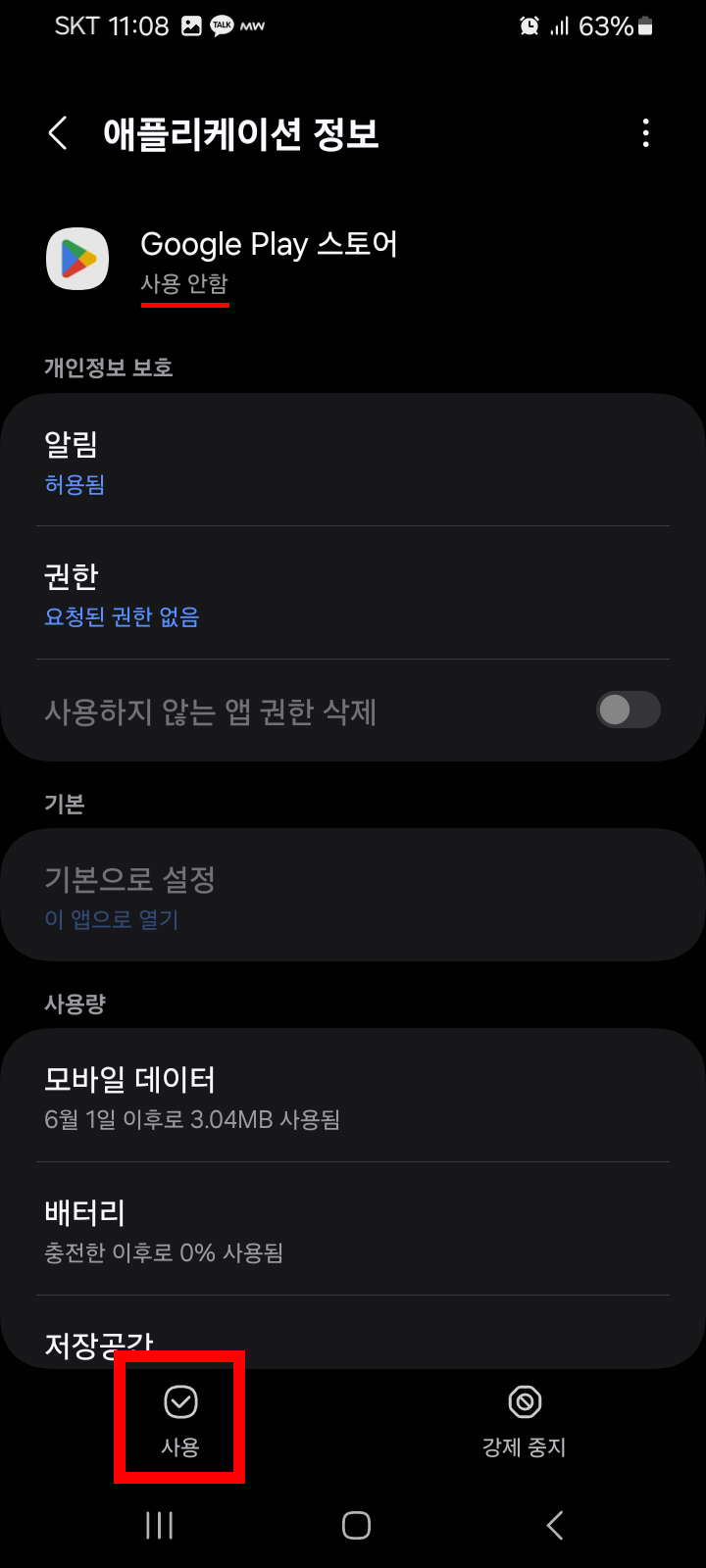 3) κ²μμμ 'google play'λ₯Ό κ²μν΄ λ³΄μΈμ. Google Play μ€ν μ΄ λ°λ‘ μλμ 'μ¬μ© μν¨'μΌλ‘ λμ΄ μμ μ μμ΅λλ€. 'μ¬μ© μν¨'μΌλ‘ λμ΄ μλ€λ©΄ λ°λ‘ λ€μ΄κ°λ³΄μΈμ.