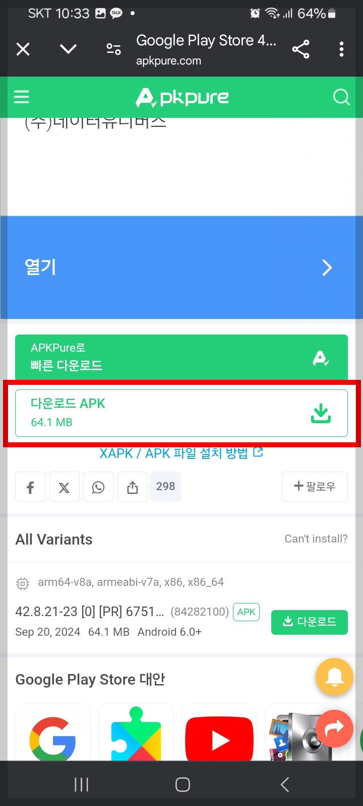 1) ꡬκΈμμ 'google play store apk'λ‘ κ²μν΄λ³΄μΈμ. κ·Έλ¬λ©΄ μ€κ°μΌλ‘ λ΄λ €λ³΄λ©΄ https://apkpure.com λ€μ΄λ‘λλ μ¬μ΄νΈκ° λμ΅λλ€. κ·Έμͺ½μΌλ‘ λ€μ΄κ°μΈμ.