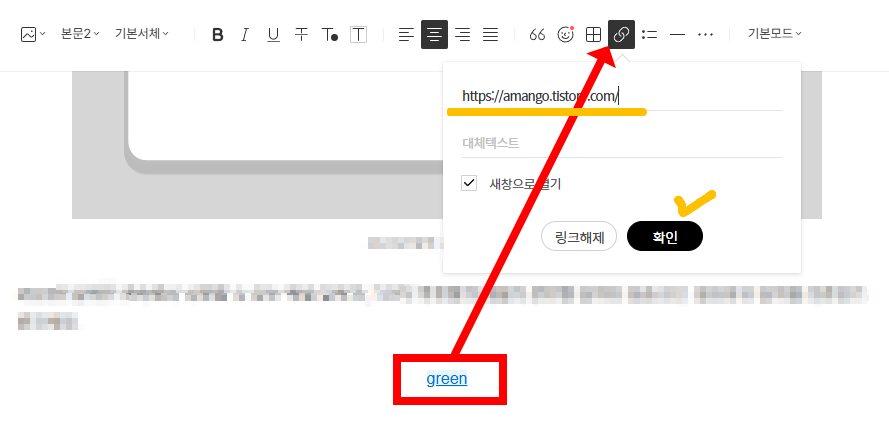 12) green์ด๋ผ๋ ๊ธ์์์ ์ปค์๋ก ์ ํํ ํ ์๋จ์ ์๋ ๋งํฌ ์์ด์ฝ์ผ๋ก ๋ค์ด๊ฐ์ ์ํ๋ ์น์ฃผ์๋ฅผ ๋ฃ๊ณ "ํ์ธ"์ ๋๋ฅด๋ฉด ์์ฑ๋ฉ๋๋ค.