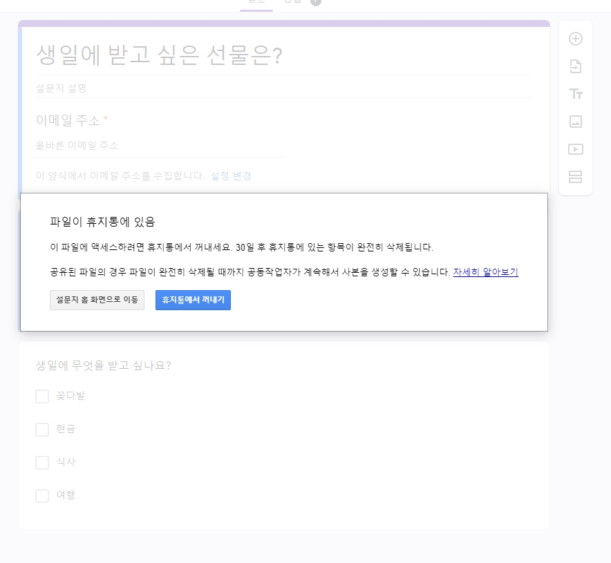 ์์ ์๋ ๊ตฌ๊ธ๋๋ผ์ด๋ธ์ ํด์งํต์์ ์ญ์ ๋ ์ค๋ฌธ์ง๋ฅผ ๋ณต๊ตฌํ๋ฉด ๋ฉ๋๋ค.